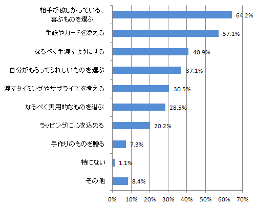 贈るときに心掛けていることの2番目には「手紙やカードを添える」3番目には「なるべく手渡すようにする」があがり、贈るときには心を届ける配慮を大切にしていることがわかります。