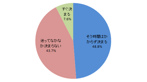 すぐ決まる、そう時間はかからず決まるという人は半数強の56%。他方、迷ってなかなか決まらない人は44%です。なかなか決まらない人は、プレゼントの提案をしてくれるサイトや冊子など、ヒントになる情報を求めています。