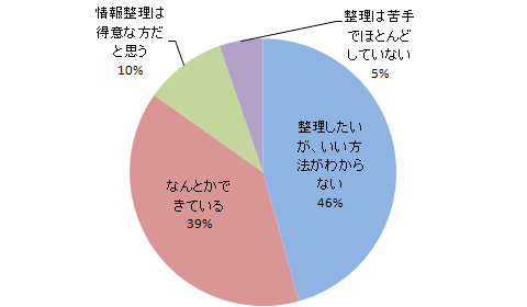 情報の整理はうまくできていますかという質問には、いい方法がわからない46%、何とかできている39%、得意な方だと思う10%、苦手でしていない5%という回答結果でした。