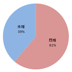 アンケートにお答えいただいた、現在クリアーポケットフォルダを使っている626名のプロフィールをご紹介します。女性82%、既婚率は61%です。 年代は、30代前半を頂点に山形を描いています。約6割の人が働いています。