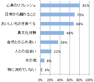 - 日常から離れ、心身共にリフレッシュすることが、旅に出る一番の目的です。食べる楽しみ、異なる文化に触れる楽しみ、美しい自然や人との出会いも旅の醍醐味です。