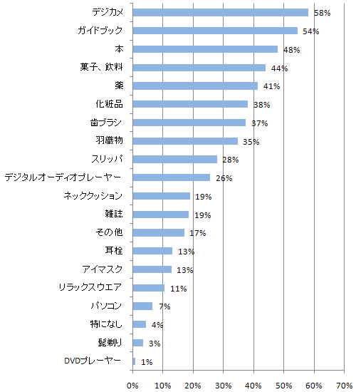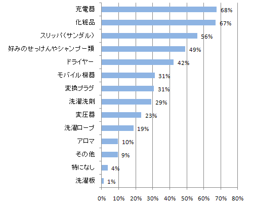 デジカメや携帯を持って行く人が多いので、ホテルでは充電しますし、化粧品はやはり肌に合ったものを持って行くのでしょう。半数の人がせっけん、シャンプー類も好みのものを持って行くと答え、ドライヤーの持参率は4割を超えています。ヘアーケアは自分専用のものでという人が少なからずいます。