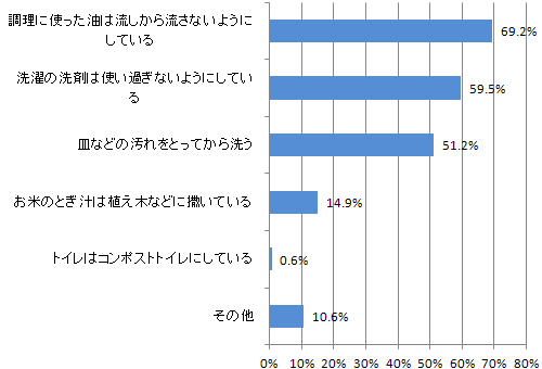 排水への気配りに関しては、調理に使った油は流さない69.2%、皿などの汚れをとってから洗う51.2%となど調理の汚れを流さない工夫をしている人は多く、また、洗濯の洗剤は適量を使うようにしている59.5%と、家庭排水について気を使っています。重曹や純せっけん、お酢など環境に負荷の少ない洗剤を使っている人も数多くいます。