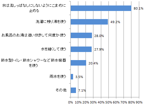 食器洗いも洗い桶に貯めてなど、水は流しっぱなしにしないは80%、風呂残り湯利用49% と節水の工夫がされていますが、食洗機、節水型洗濯機、節水型シャワーヘッド、蛇口の節水コマなど節水機器の使用率は20%と低い数値でした。その他、洗髪などには極力お風呂のお湯を使い、シャワーの量を減らしたり、雨樋から雨水をため庭の花木用にしているという人もいます。