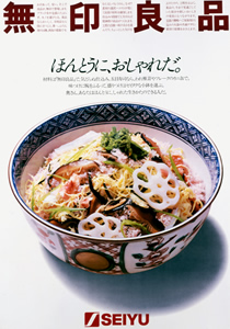 アイテム総数が40、食品31アイテムで立ち上がった無印良品の初めてのお正月。ちらし寿司の素材には、われ椎茸を使っています。おいしさを引き立てる演出に、伊万里のお椀をディレクターが持ち出しました。素材は見かけより味。選んだ器に愛情込めて盛りつけるあなたの生き方がおしゃれだとメッセージを送っています。
