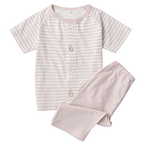 素材は、スムース編みや二重ガーゼなど、肌触りのよい綿(オーガニックコットン)100%。夏用には涼しい綿サッカー生地、冬用にはネル素材が加わるなど季節にも合わせています。