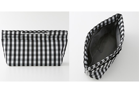 サッと出し入れできるよう、素材はすべりのよいナイロンやポリエステル。中が見えやすいよう、内側には明るい色の生地を使っています。形は逆台形の広口。開いたまま自立するので、出し入れに便利です。ファスナー付きの内ポケットは貴重品入れに、外側のポケットや仕切りは整理しながらの収納に。引き紐が付いていますので、バッグから出してこれだけでも持ち歩けますし、不要なときは紐を収納できます。