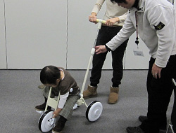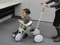 2歳6ヶ月(90cm)のこの子は三輪車は初めてです。試作車には大変興味を示しさっそく乗ってくれました。でもまだ慣れてないためかペダルは漕げずハンドル操作もできません。後ろから押そうとすると、「自分で!(漕ぐ)」と意欲的。