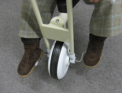 こういう場合は、前車輪をロックする機能を付けてましたので、ロックするとべダルがフリーになり(ギアから外れる)、後ろからそっと押しても本人は自分で漕いでいるつもりになれます。
