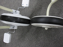 タイヤ幅が太くなることに関しては、安定感があっていいという人と、細い方(既存品)がスマートでいいという意見が出ました。試作車は従来品と比べて安定感を増すためにタイヤの全体の幅を太くしていますが、逆に接地面での抵抗を少なく、より漕ぎやすくするためにトレッド部分(黒い面)は幅を短くしています。開発担当者の悩みどころです。