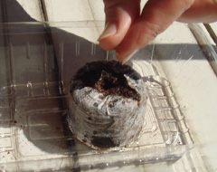 膨らんで大きくなった育苗ポットの中央へ、種を入れた社内モニター。自然にできたくぼみへ、そのまま種を置いています
