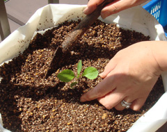 - 小回りのきく、コテのようなシャベルを使って苗を移植していたモニター。「小さなスコップがちょうどよく、植え替えに便利でした」。