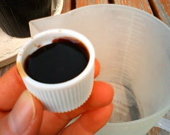 - 300倍に薄めて使う有機液体肥料は、1.5リットルの水にキャップ1杯が目安。細かい目盛付きの計量カップで希釈液をつくったこのモニターは、その後、注ぎ口から直接、水やりをしていました。