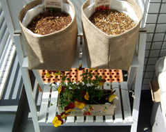 - 種まきした後、ネットをかけたモニター。「すずめがしょっちゅう来て、種をほじくりかえすからです。またネットがあると水まきしやすく、水が一か所にドド~っと流れずにすみます」。また、ベランダの床がコンクリートのため、「水分でじめじめしたり、麻の袋に入れた時に底が腐ったりしないようにレンガの上に置きました」。
