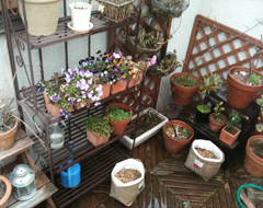 - ウッドデッキを敷き、棚とラティスで高さを出して、鉢を飾りつけていたベランダ。ちなみに現在はここから改修中で、「シチリアのイメージを元に、ウッドデッキをやめてタイルを敷き、花々も置く予定」だそう。