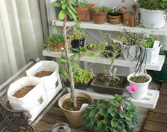 - 背の高い観葉植物や、大ぶりなシクラメンなどの鉢花はウッドデッキの上に直接置き、小さな鉢は、ひな段式のシェルフを使って飾っています。高さを意識したコーディネートで、ベランダの小さなスペースに、メリハリが生まれています。
