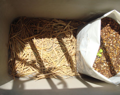 - 野菜栽培キットを、底面にワラを敷いた大きなプランターへ、3つまとめて収めたモニター。「大きなプランターに入れたのは、3つ一緒に動かしやすかったこと。ワラを敷いてみたのは、熱が伝わりにくいかなと思ってやってみました。効果はまだわかりません。真夏の熱から守れるかどうか、やってみようと思っています」。