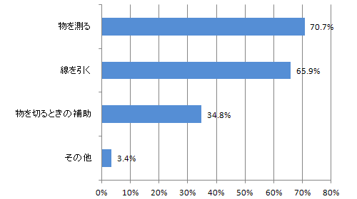 不便を感じている方の7割近くの方が物を測ったり、線を引いたり、という用途で不便を感じるようです。左利きの方は決まった長さの線を引く時に、「0」とは反対側の右からペンを動かし、引き算をしないと長さが解らないという意見があつまりました。中には、プラスチックなど透けている定規を裏返す事で「0」を右側にして使うなど工夫している方もいらっしゃるようです。