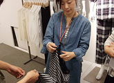 今回、社内で授乳経験のある女性社員にも、出来上がったサンプルを着てもらい、意見をもらいました。今回フィッテングしてもらったのは、いずれも店舗で働いているスタッフです。 お母さんとして、販売員としてなど、さまざまな視点でサンプル商品のチェックをしてもらいました。 使いやすさとしては、授乳口の開き具合に対して、「開きが小さいと母乳でウェアがぬれてしまうことがあるが、開きが大きくて良い」、「かぶせ布は赤ちゃんの頭が隠れるくらい長さがあるので良い」などの意見がありました。 またシルエットに関しては、「こどもと一緒にしゃがんだりすることが多いので、しゃがんだ時に背中が出ない着丈が良い」ということでした。 素材については、店頭にいらっしゃるお客様からも「授乳服には肌に優しいものを」という要望を多くいただくということで、授乳服を選ぶ重要なポイントのひとつということを改めて確認しました。
