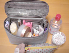 などでした。お化粧品は、基礎化粧品、メイクアップ用品、様々な道具類と多種多様、人によって持っている量も異なります。迷ったのは、どんなサイズにするかです。