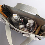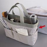 - モニターさんには、移動性、サイズ、素材とも高い支持をいただきましたが、「小さいものが取り出しにくい」「入りきらない」という課題もいただきました。ポケットを大幅に見直し、背の高いものも入るように思い切ってオープンタイプにしました。オープンタイプの方が使いやすい場面も多いとも考えました。容量については、必要最低限のものが入り、基礎化粧品とメイクアップなど、小分けを想定したものという当初の考えに変わりはありません。