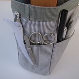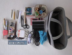 内側の移動できるポケットには2段使いにして糸と針を、周りのポケットには、ハサミ、ヘラ、糸切、ゴム通しなどのさっと取り出したい道具類を入れました。ボタン類を入れたプラスチックのケースやゴムやしつけ糸なども入りましたので、ほぼこれでちょっとした裁縫はできると思います。