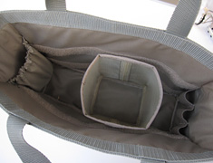 オープンタイプにしポケットを外側にも内側にも付け、小物が入れられ、さっと取り出せるようにしました。