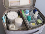 綿棒ケースや消毒薬を基準に、ポーチの高さを少し浅くし、中がひと目で見やすいようにしました。また、移動できるポケット付仕切りを付け、中身がたくさん入っても形状を保てるようにしました。仕切りは必要なければ取り外し、側面に貼り付けておくこともできます。他、蓋裏のポケットや取っ手など、よりかっちりと仕上げてあります。