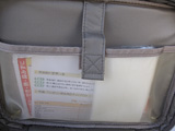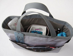 そこで、収納量がたっぷりあり、中が見やすく、内ポケットの工夫をしたサンプルをつくりました。素材は、汚れたらふき取りやすいビニールコーティングの布製です。