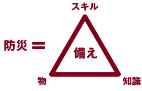 防災とは、いわば災害に備える事です。備える事は、「物」「知識」「スキル」の大きく3つに分ける事ができます。