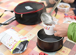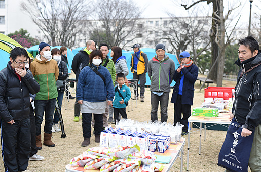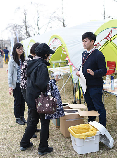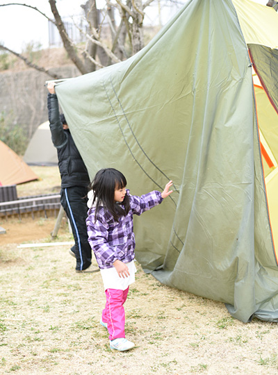 家族ごとに、テントを自力で組み立て、節水、節電の制約の中での調理を体験します。