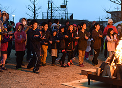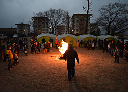 日が沈みかけると、キャンプファイヤーが始まりました。町田市消防局の方が見守る中、大勢の参加者で火を囲みました。インストラクターの指揮のもと、一体となって遊び、子供達は大喜び。