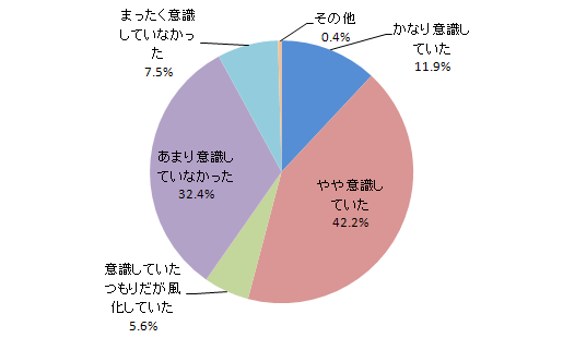 日常から、地震についてどの程度意識していましたかと聞いたところ、『やや意識していた』42%、『かなり意識していた』12%と、過半数の方が意識していたと答えています。
