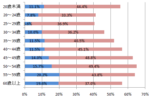意識の比較的高かった人を、年齢別に見てみると、50代が最も高く、年代が若くなるほど意識が低くなっている傾向でした。