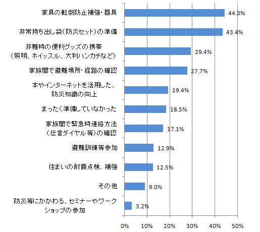 約半数の方が日頃から地震に対して意識しており、家具の転倒防止や非常持ち出し袋の用意などはしていました。しかし今回のような大震災に直面し、準備していたものが役に立たなかったり、不十分だったことに気づく方も多かったようです。