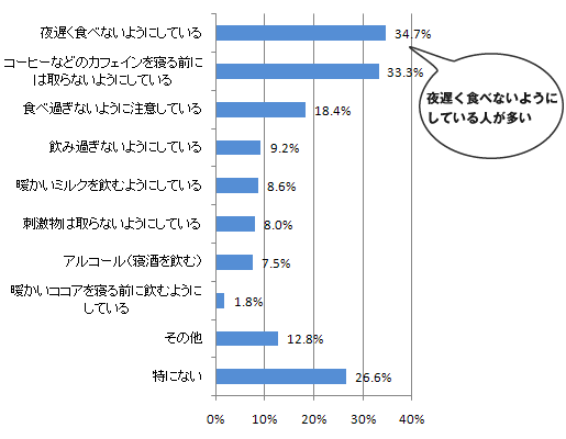 多くの方が食事やお酒に注意しています、特に眠る前には食事をしないというのも多いです、眠る直前の食事は、眠りだけでなく、健康にもよくないといわれています。一方寝る前にアルコールを飲むというかたも、7.5%もいます。