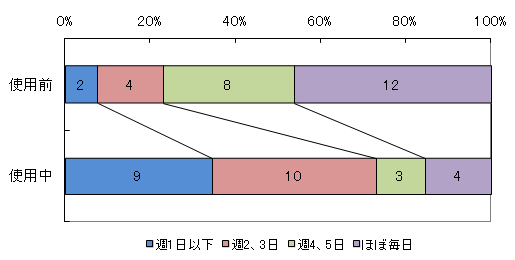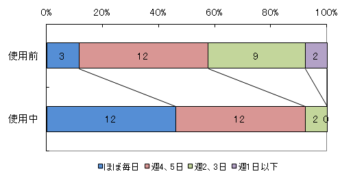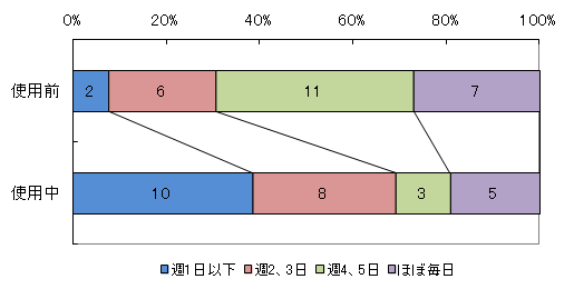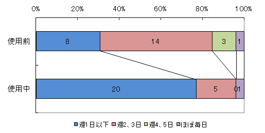 使用前と比べて、週あたりの睡眠時間が足りないと感じる頻度に減少傾向が見られます。寝つきがスムーズになったことで睡眠時間が増えたことがプラスに作用していると考えられます。
