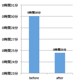 22人の寝付き時間の平均値を調べたところ、30分→25分と5分の短縮が見られました。