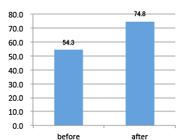 実験後のアンケートで「眠りの満足度」を100点満点で採点してもらったところ、これまで54点だった平均値が、74点と20ポイントも上昇(グラフ②)し、よいねむりが得られた実感が表れています。