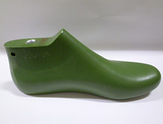 - まず基準となる1サイズを設定し、足長と足囲はJIS規格の寸法に則って、それ以外は甲の高さやかかとの形状など職人さんの経験から、細かい部分まで人の足を模して「足の設計図」を書きます。その設計どおりに型をおこし、樹脂を流し込んで完成させます。 このラストの作成は、職人さんの長年の経験と技術が必要で、それが各社の大切なノウハウなのだそう。今回は製造をお願いする取引先の方に作っていただきました。