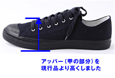 - 改良品のラストは現行品よりも足囲を少し大きくし(JIS規格のEサイズ)で設計し、アッパー(甲の部分)が少し高くなるようにつくりなおしました。これから行なうスニーカーの設計はすべてこのラストに合わせて行ないます。