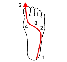 - 2)足の外側を通って小指の付け根付近まで前方に重心が移動