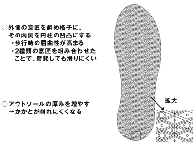 アウトソールは「綿スニーカー」と「綿洗いざらしスニーカー」で別々の設計と意匠(デザイン)にしました。「綿スニーカー」はあおり歩行をサポートし、重心移動をスムーズにすることを重視した意匠に、「綿洗いざらしスニーカー」はもともとのやわらかい履き心地を損なわず、アウトソールのすり減りを軽減することを重視した意匠にしました。