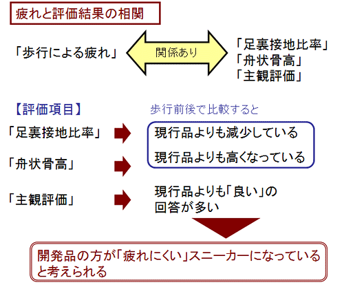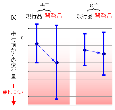 この歩行評価は「歩きやすい」「疲れにくい」を実現することを目的として設計した開発品が、ねらい通りにその機能が出せるのか確認するための評価です。今回はその結果の一部を紹介します。