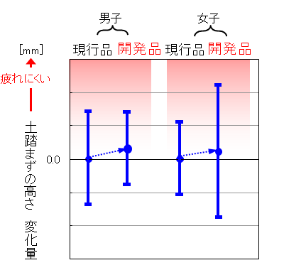 以上の結果から、開発品の方がより土踏まずの低下を抑制でき、疲れにくさに繋がっていると考えられます。