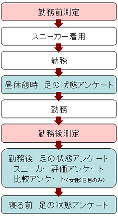 このスケジュールを男性は2日間、女性は3日間、現行品と開発品で行なってもらいました。 また今回は足の状態を自己申告してもらうアンケートを1日に3回実施しました。これは、前回の8月の計測時に、「時間が経ってからのほうが疲れを感じた」という意見があったためです。