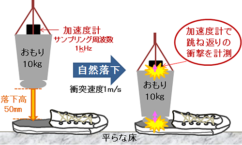In our experiment, we evaluated the shock absorbability of the sole by dropping 10 kg weight onto the sole placed on the level floor and measuredthe impact acceleration. ・・・