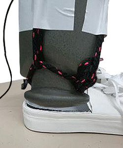 この実験方法を用いて着地衝撃による脚の負担を検証しました。