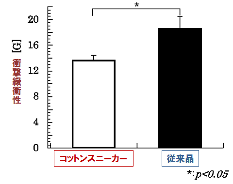 ・・・従来品の衝撃加速度は18.6±1.8Gで開発品のスニーカー(コットンスニーカー)は13.7±0.7Gであった。