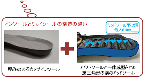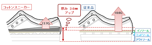 コットンスニーカーが、従来品に比べて大きく衝撃緩衝性がアップした秘密は、インソールとアウトソールに加え、アウトソールのインソール側にあるミッドソールの構造にあります。